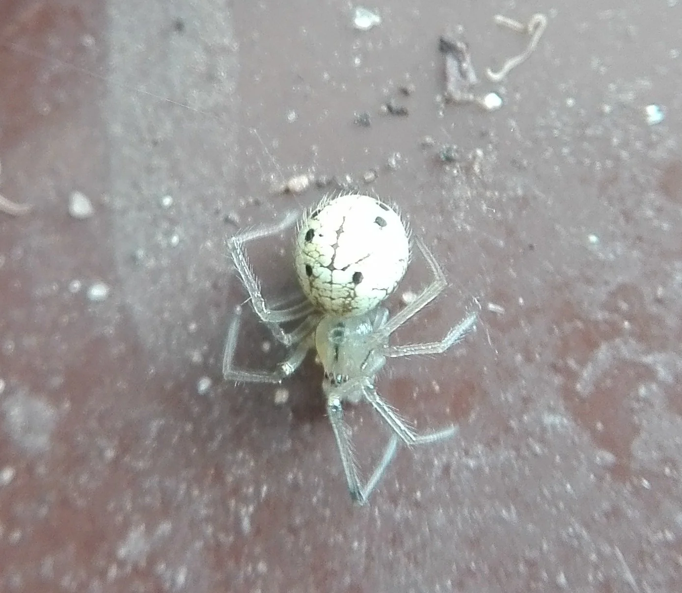 Another indoor spider this month was Philodromus dispar (#581) , found crawling across the bathroom wall. This is a garden spider, that sometimes ventures into houses. Males, like this one are dark with pale legs and undersides; the females are brown and not so easy to identify.