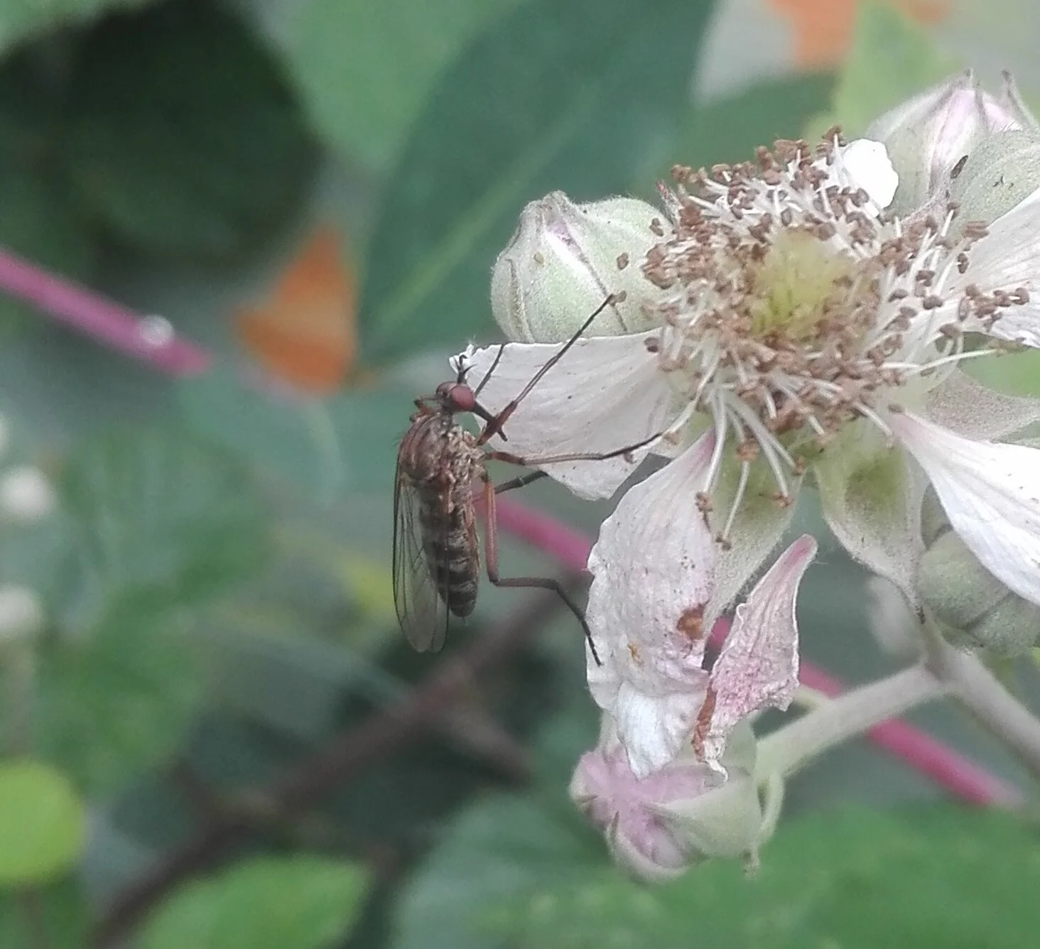 This is my first “dagger fly” found in the garden; so-named because of its long beak. These come for nectar, as in this case on the flowers of a bramble, but are also predators. Courtship consists of the males offering prey to females, with the most favoured prey getting the girl. There are a few species, but this one with it’s reddish coloured legs (including the thighs) is I believe one of the commoner ones.